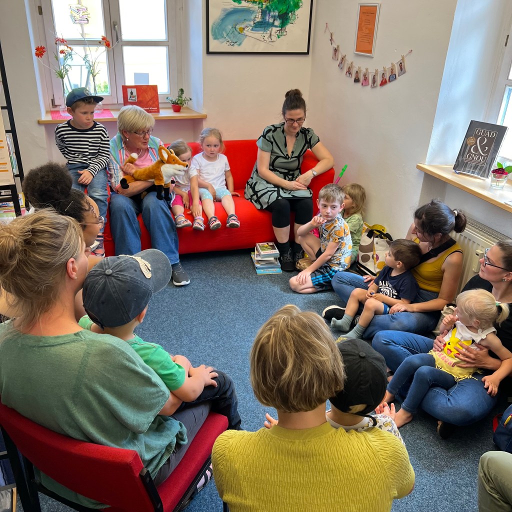 Jeden ersten Freitag im Monat wird bei uns in der Bücherei vorgelesen. Verschiedene Lesepaten lesen auf unserer roten Couch aus ihren Lieblingsbüchern für die Kindern vor und binden sie mit Fragen in die Geschichten ein. Der Büchereifuchs darf natürlich auch nicht fehlen.