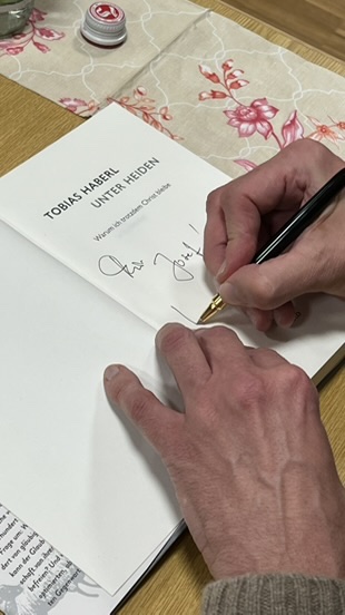 Im Anschluss an die Lesung organisierte Peter Hartung den Verkauf von Haberls Büchern. Der Autor selbst stand noch zu persönlichen Gesprächen bereit und signierte auf Wunsch die gekauften Bücher.