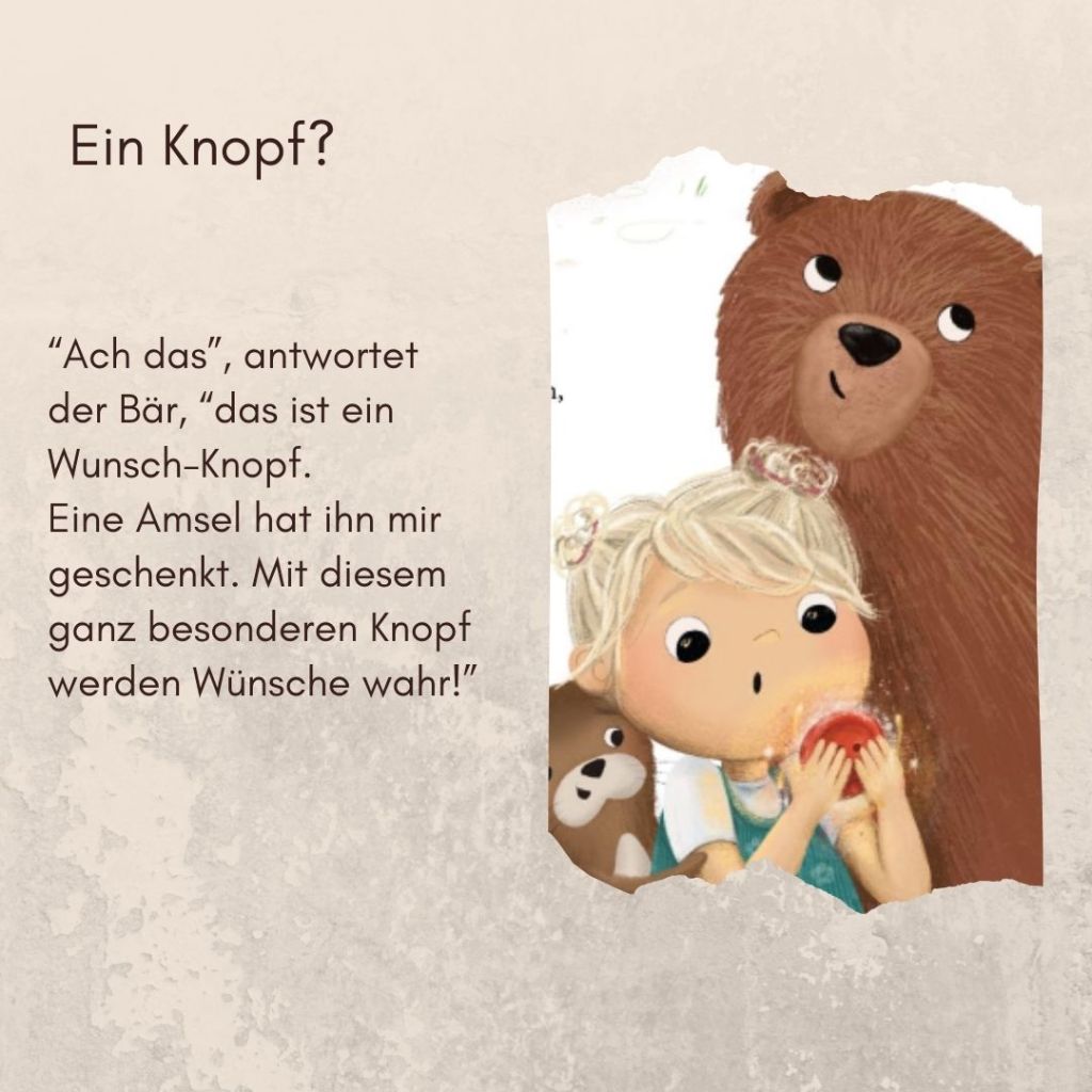 Ein magischer Knopf? Und der kann Wünsche erfüllen? Tilli, Otti, Isaiah und Jola sind total aufgeregt! Wenn man seine Wünsche richtig formuliert und ins Universum schickt, erlebt man die tollsten Abenteuer. Tilli erkundet die Unterwasserwelt, Otti reist ins Weltall, Isaiah probiert die leckersten Gerichte dieser Erde und Jola fühlt sich plötzlich wieder wie ein junges Kätzchen. (©️humblebutbold)
